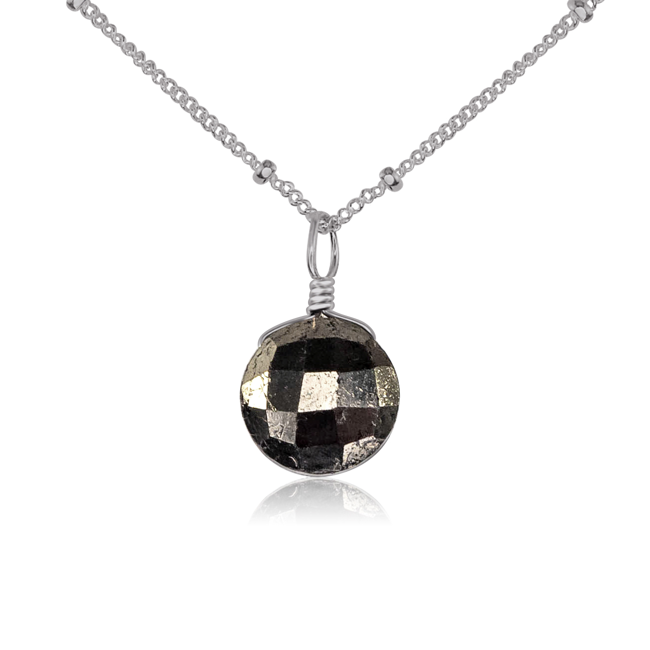 The Faceted Pyrite Crystal Circle Pendant Necklace shimmers with an earthy metallic glow, reflecting light like sunlight dancing on still water. Pyrite, known as the stone of abundance and confidence, carries the grounding energy of the earth while igniting inner strength and determination. Its faceted circle shape symbolises wholeness and flow, reminding the wearer to stay centred and radiant through life’s ever-changing rhythms.