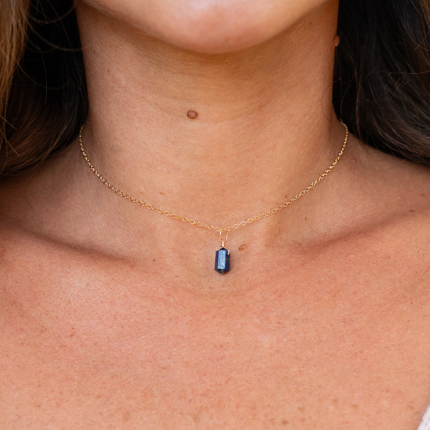 Lovingly handmade, this dainty choker is available in sterling silver, 14k gold fill, 14k rose gold fill, or stainless steel. Its mini pendant design is subtle yet striking, crafted to be durable with a secure spring ring clasp. Non-tarnish and made to last, it is perfect for everyday wear, keeping the empowering energy of Lapis Lazuli close to your throat and heart.